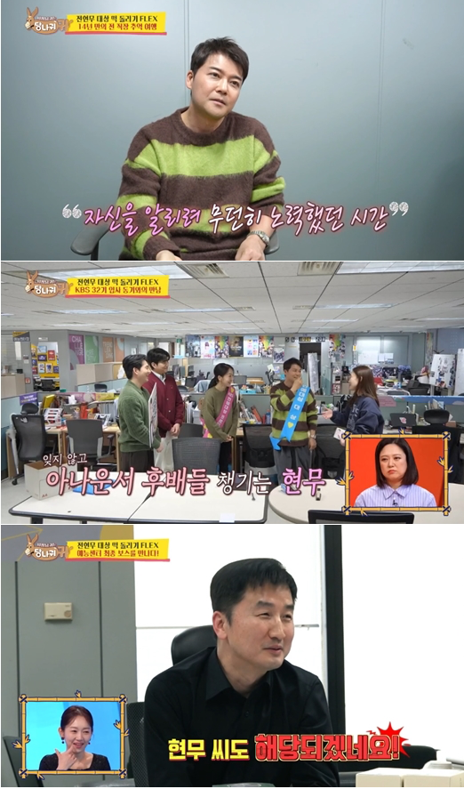 이날 전현무는 엄지인, 김진웅, 남현종과 함께 KBS 예능센터를 찾았다. 그는 “야심 많은 남자 아나운서가 능력이 있다는 걸 보여주고 싶어 6층에 자주 올라왔다. 오랜만에 모교에 온 느낌”이라고 말했다. 제작진에게 떡을 돌리며 “덕분에 상을 받았다”고 인사를 전한 그는 ‘더 시즌즈’ 손자연 PD와 ‘1박2일’ 주종현 PD를 만나 후배 아나운서들의 출연을 적극적으로 추천했다.
