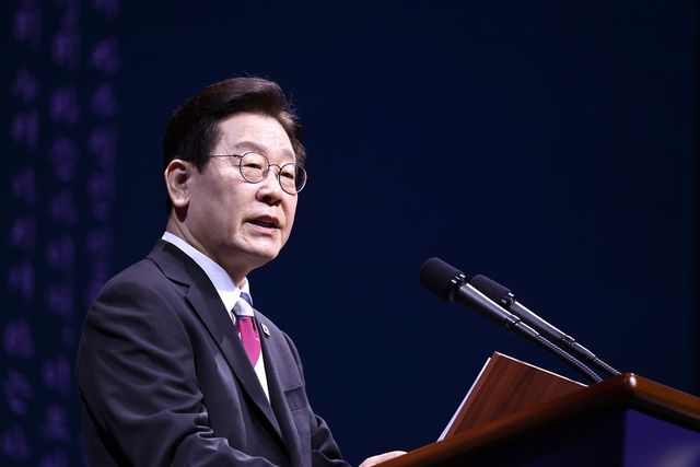 이재명 대통령 자료 사진. 이 대통령이 1일 서울 강남구 코엑스에서 열린 제107주년 3·1절 기념식에서 기념사를 하고 있다. 리얼미터가 에너지경제신문 의뢰로 지난달 23~27일 전국 18세 이상 2507명을 대상으로 조사한 결과 이재명 대통령의 국정수행을 긍정 평가한 응답자의 비율은 57.1%로 나타났다. 이는 직전 조사보다 1.1%포인트(p) 내린 수치다. / 뉴스1