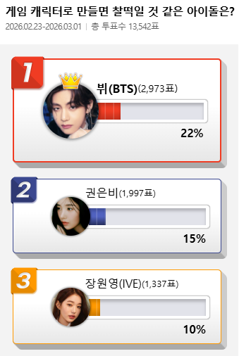 디시인사이드는 2월 23일부터 3월 1일까지 7일간 ‘게임 캐릭터로 만들면 찰떡일 것 같은 아이돌은?’을 주제로 투표를 진행했다. 총 1만3542표 가운데 2973표(22%)를 얻은 뷔가 1위를 차지했다.