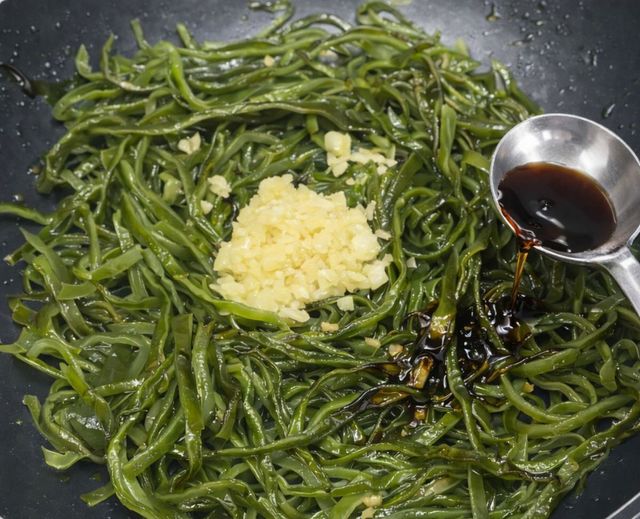 물기를 꽉 짠 뒤 5cm 길이로 썬다. 길이가 일정해야 볶을 때 양념이 고르게 묻는다. 팬에 들기름 2숟갈을 두르고 다진 마늘 1숟갈을 먼저 볶아 향을 낸다. 마늘 향이 올라오면 미역줄기를 넣고 센 불에서 3~4분간 충분히 볶는다. 이 단계가 비린내를 줄이는 과정이다. 수분이 날아가면서 색이 선명해진다.