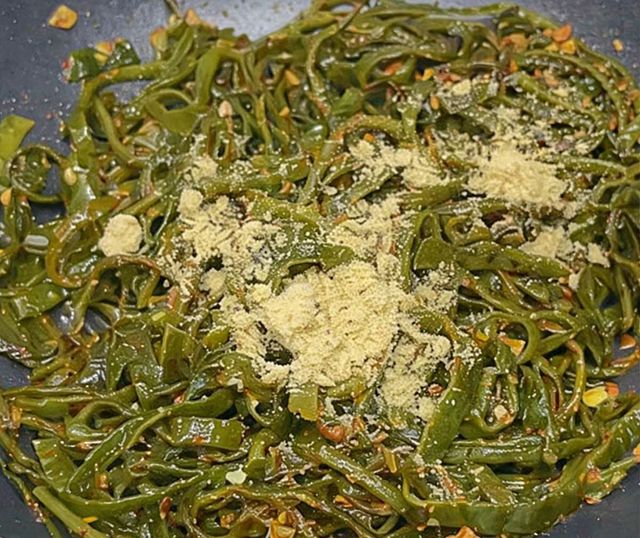 이제 들깨가루 2숟갈과 고춧가루 0.5숟갈을 넣는다. 들깨가루는 볶음의 질감을 바꾼다. 단순한 고소함을 넘어 소스처럼 미역줄기를 감싸는 역할을 한다. 고춧가루는 매운맛보다는 색과 향을 더한다. 물이 자작하게 남아 있어야 들깨가루가 미역에 착 달라붙는다. 수분이 부족하면 들깨가루가 뭉치고 거칠게 느껴질 수 있다.