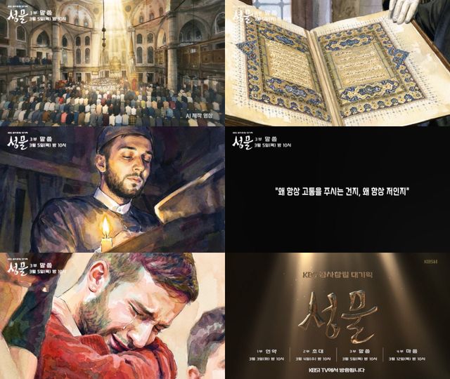 대기획 ‘성물’ 4부작은 3월 3일 1부 ‘언약’ 첫 방송 이후 4일 2부 ‘초대’, 5일 3부 ‘말씀’, 12일 4부 ‘마음’을 KBS1를 통해 선보인다.