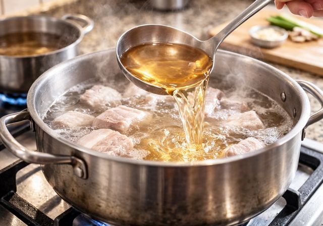 돼지고기를 삶을 때 배 달임물을 넣는 모습. 기사 이해를 돕기 위해 AI를 활용해 제작한 자료 사진입니다. 실제 모습과 다소 차이가 있을 수 있습니다.