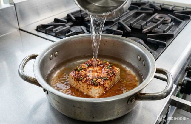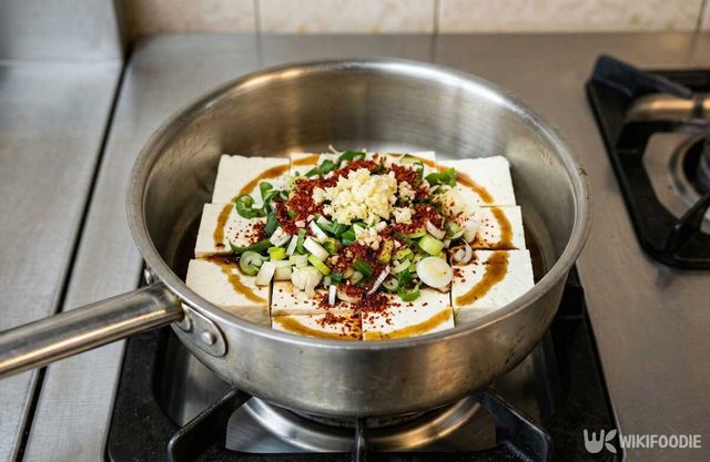 물은 두부가 잠길 정도로만 붓는다. 과하게 넣으면 맛이 묽어진다. 조선간장을 넣어 간을 맞춘다. 조선간장은 국물 맛을 또렷하게 잡아주고, 적은 양으로도 충분한 감칠맛을 낸다. 국간장으로 바꿔도 무방하다.