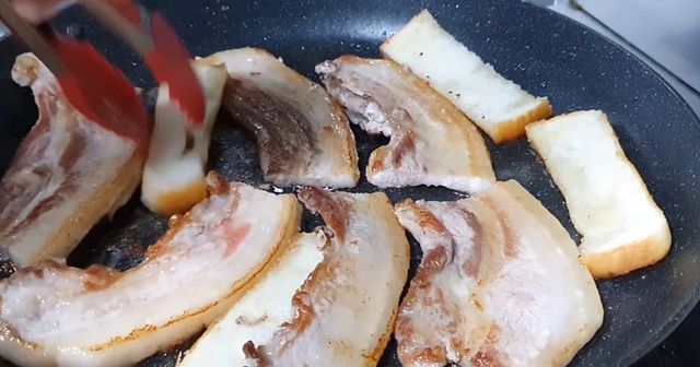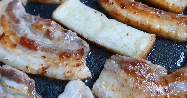 다섯째, 기름 관리는 필수다. 삼겹살은 지방이 많은 부위이기 때문에 굽다 보면 기름이 많이 나온다. 이 기름을 그대로 두면 고기가 기름에 잠겨 튀겨지듯 익고, 식었을 때 질척한 식감의 원인이 된다. 이때 유용한 방법이 바로 식빵을 활용하는 것이다. 팬 한쪽에 식빵 조각을 두면 흘러나온 기름을 자연스럽게 흡수한다. 키친타월보다 타지 않고, 기름 흡수력이 좋아 깔끔하다. 기름을 적절히 제거해주면 고기는 겉은 바삭하고 속은 담백하게 완성된다.