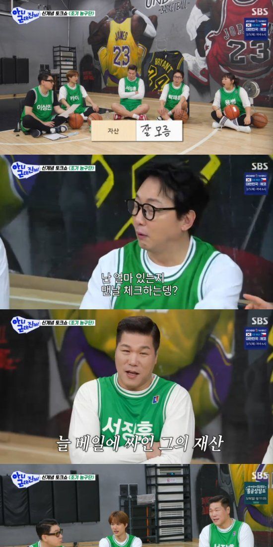 이날 4MC 탁재훈, 이상민, 이수지, 카이는 '조기 농구단' 콘셉트로 방송을 진행했고, 서장훈이 입단 신청서를 냈다. 입단 신청서에는 '자산'에 대한 질문도 있었고, 서장훈은 '잘 모른다'고 써놨다.