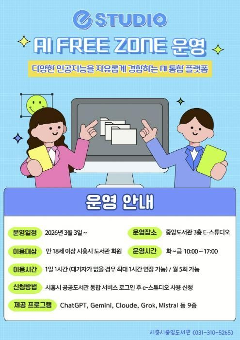 [와이뉴스] 시흥시중앙도서관은 시민들의 인공지능(AI) 활용 역량 강화를 위해 시 정보통신과와 협업해 도서관 3층 e-스튜디오에 ‘인공지능(AI) 프리 존(Free Zone)’을 구축하고, 오는 3월 3일부터 본격 운영에 들어간다.