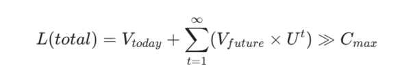 이 식을 보면 명확해진다. 우리가 내일과 내년의 문을 열어두는 순간 뇌가 처리해야 할 인지 부하(Ltotal)는 미래의 불확실성(U)이 시간(t)승으로 곱해지면서 계산값은 순식간에 무한대(∞)로 발산해 버린다. 결국 고정된 전두엽 용량(Cmax)을 넘어서며 시스템은 과부하(Overload)로 다운된다.