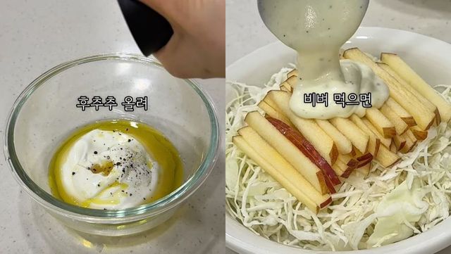 완성된 소스와 사과와 양배추에 소스를 올린 모습. / 유튜브 '하페테리아 hafeteria'