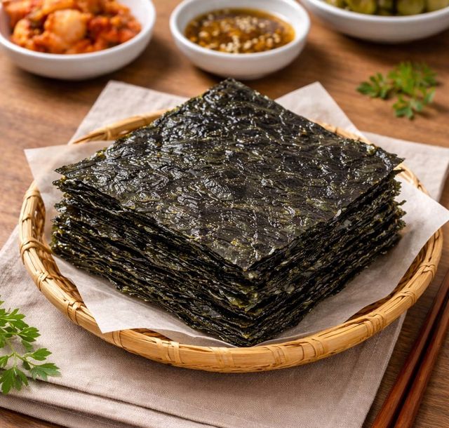 김 자체의 영양도 수치로 확인하면 놀랍다. 해조류 중 단백질 함량이 가장 높은 것이 김인데, 건조 기준 100g당 단백질이 46g에 달한다. 미역, 다시마, 톳, 파래 등 11종의 해조류를 비교한 분석에서 김이 가장 높은 수치를 기록했다. 마른 김 5장의 단백질 함유량이 달걀 한 개와 맞먹는다는 해양수산부의 자료도 있다. 식물성 식품임에도 불구하고 이 정도의 단백질 함량을 가진 식재료는 흔하지 않다.