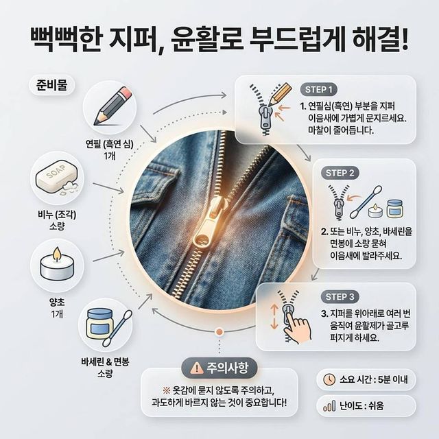 뻑뻑해진 지퍼는 윤활로 해결할 수 있다. 연필심(흑연)을 지퍼 이음새에 가볍게 문지르면 마찰이 줄어들어 움직임이 부드러워진다. 비누나 양초, 바세린을 면봉에 소량 묻혀 사용하는 방법도 효과적이다. 단, 옷감에 묻지 않도록 주의하고 과도하게 바르지 않는 것이 중요하다.