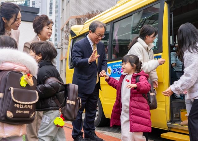 | ▲ 동래구 소재 유치원 아침 등교 맞이 모습(김석준 교육감) |