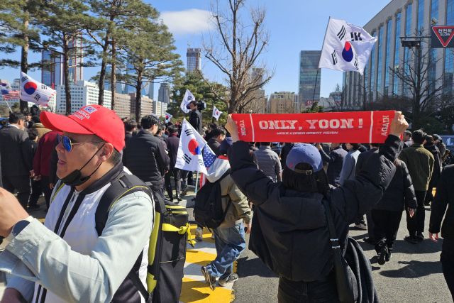 다수 국민의힘 의원이 당 색인 붉은색 목도리를 둘렀고, 몇몇 지지자들은 붉은색 손팻말을 들었다. 이들의 손팻말에는 'YOON AGAIN'(윤어게인)을 비롯해 부정선거 음모론을 주장하는 'STOP THE STEAL' 문구가 내걸렸다. 태극기와 성조기, '이재명 재판 속개' 현수막도 한곳에서 펄럭였다.