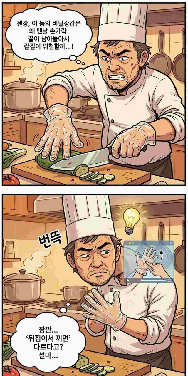 요리할 때 위생 비닐장갑은 이제 선택이 아닌 기본 도구가 됐다. 고기 손질부터 양념 무침, 김치 담그기까지 손에 직접 닿는 부담을 줄이기 위해 자연스럽게 사용한다. 그런데 많은 이들이 불편함을 느끼는 부분이 있다. 손가락 끝이 헐렁해 칼질이 불안하거나, 반죽을 하다 보면 장갑이 벗겨지는 상황이다. 이 문제를 의외로 간단하게 해결하는 방법이 있다.