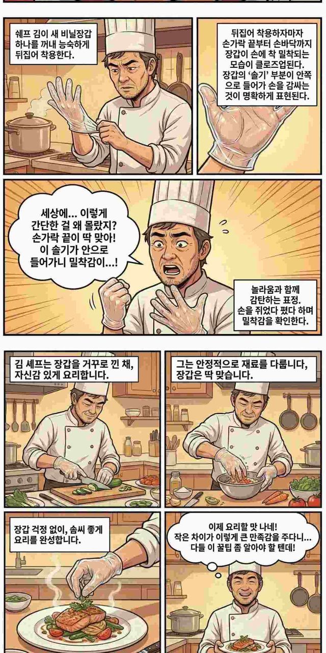 작은 방향 전환 하나가 사용성을 바꾼다. 새로운 제품을 사지 않아도 기존 도구를 더 효율적으로 활용하는 방식이다. 요리할 때 손끝이 답답하게 느껴졌다면, 다음 번에는 장갑을 그냥 끼지 말고 한 번 뒤집어 보길 권한다. 같은 장갑이지만 전혀 다른 착용감을 경험할 수 있다.