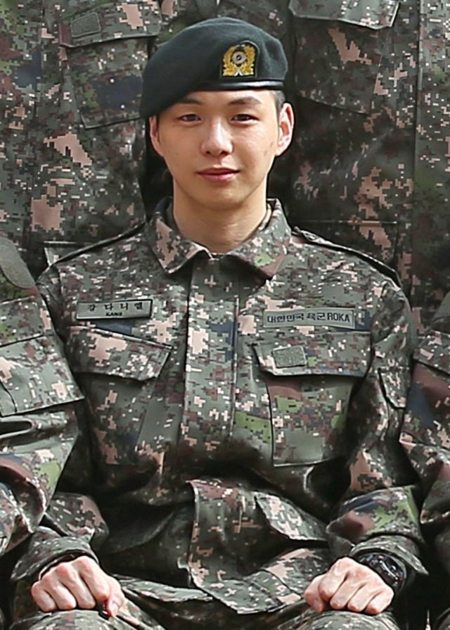 사진 속 강다니엘은 대한민국 육군 전투복과 베레모를 착용한 채 동료 장병들과 나란히 앉아 포즈를 취하고 있다. 군기 든 모습 속에서도 특유의 선한 미소가 눈길을 끈다.
