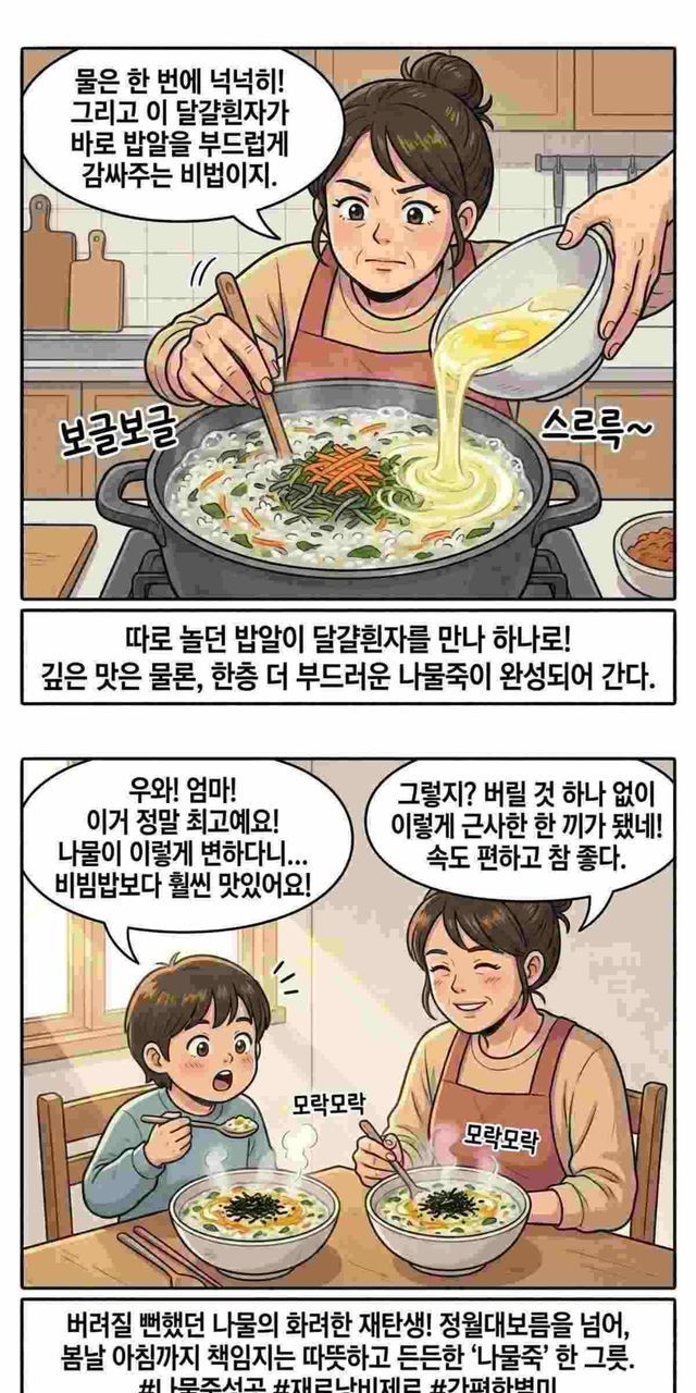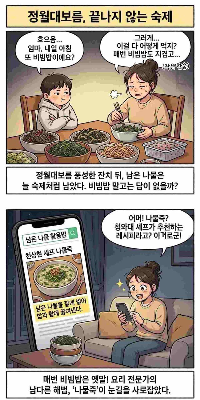 이때 요리 전문가가 추천한 또 다른 해법으로 바로 ‘나물죽’이다. 실제로 청와대 요리사로 활동한 천상현 셰프가 소개한 나물죽 레시피가 알려지며 관심을 모으고 있다. 남은 나물을 잘게 썰어 밥과 함께 끓여내는 방식이다. 특별한 재료를 더하지 않아도 깊은 맛을 낼 수 있다는 점이 특징이다.