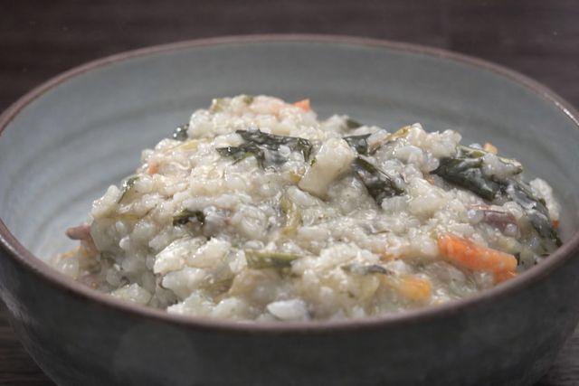 남은 나물로 끓인 죽은 아침 식사로도 부담이 적다. 이미 익혀둔 재료를 활용하므로 조리 시간도 길지 않다. 오곡밥과 함께 먹고 남은 나물의 풍미가 자연스럽게 어우러져 별도의 육수가 없어도 충분한 맛을 낸다. 당근이 들어가면 색감이 밝아져 봄철 식탁에 어울리는 한 그릇이 된다.