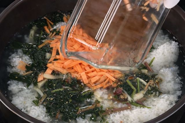 기본 재료는 흰밥과 물 그리고 남은 나물들이다. 고사리나물, 시래기나물, 취나물, 도라지나물 등 종류는 크게 상관없다. 여기에 당근, 달걀흰자, 소금, 참기름, 김가루를 더한다. 나물은 1cm 내외로 잘게 썰어 준비한다. 당근도 비슷한 길이로 채 썰어 색감을 더한다. 길쭉하게 남지 않도록 잘게 정리하는 것이 식감에 도움이 된다.