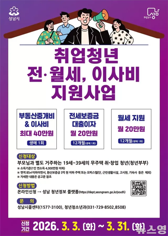 분야별 신청 자격도 다소 다르다. 부동산 중개비·이사비는 지난해 7월 1일 이후 성남시로 전입하거나 성남 지역 내 다른 동네로 이사한 청년이 대상이다. 전세보증금 대출이자·월세는 공고일(2월 27일) 기준 1개월 전 성남시 전입신고를 마친 청년이면 신청할 수 있다.