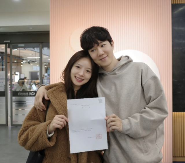 공개된 사진 속 김지영은 남편과 함께 혼인신고 서류를 들고 다정하게 포즈를 취하고 있다. 두 사람은 밝은 미소로 새로운 출발을 알렸다.