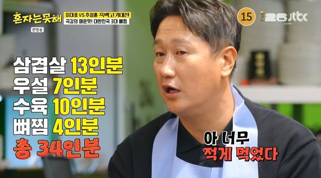 지난 3일 오후 방송된 JTBC ‘혼자는 못 해’(연출 홍상훈, 권예솔)에서는 전현무, 추성훈, 이수지, 이세희가 조선의 4번 타자 이대호와 ‘고기 끝장 투어’로 무려 34인분의 고기를 해치우며 위대한 먹방을 펼쳤다.