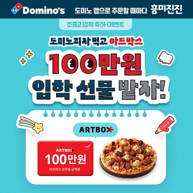 도미노피자 측은 “도미노피자 온라인 방문 포장 할인 혜택과 입학에 필요한 다양한 학용품을 구매할 수 있는 아트박스 모바일 금액권까지 모두 받아 가시길 바란다”고 전했다.