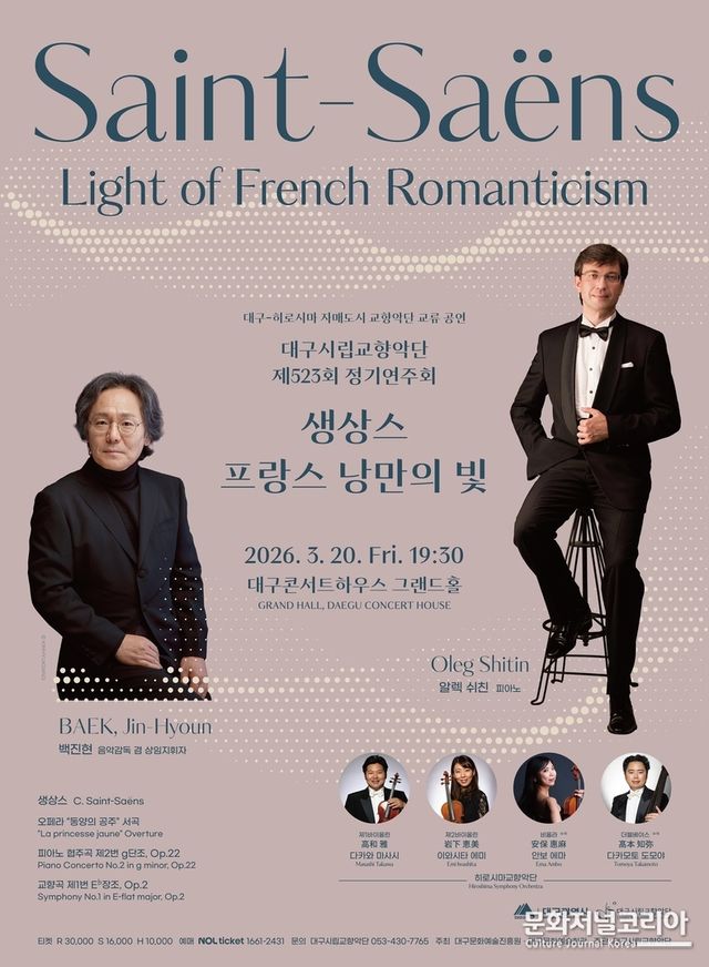 ‘생상스, 프랑스 낭만의 빛’을 부제로 백진현 음악감독 겸 상임지휘자가 지휘하고, 피아니스트 알렉 쉬친이 협연한다. 이번 공연은 생상스의 초기 음악 세계를 조망함과 동시에, 대구와 일본 히로시마의 교향악단이 음악으로 하나 되는 특별한 무대다.