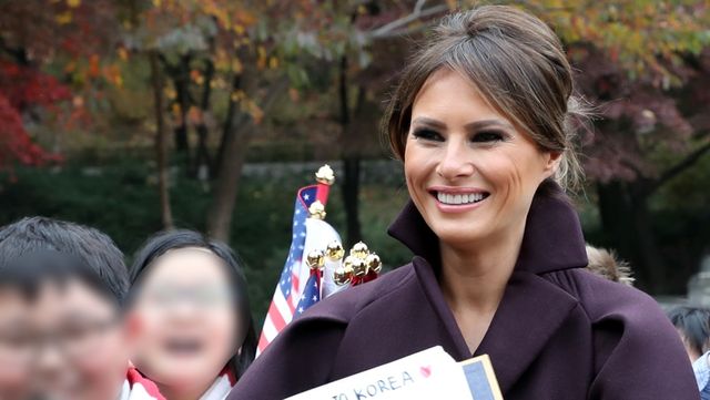 멜라니아 트럼프 여사가 2017년 11월 7일 한미 어린이 환영단의 한 어린이로부터 트럼프 대통령 내외를 그린 그림을 선물 받은 당시 자료사진. / 연합뉴스