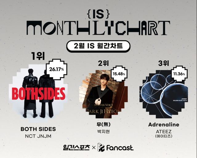 4일 일간스포츠와 팬캐스트에 따르면 NCT JNJM의 ‘보스 사이즈’는 2월 한 달간 매주 진행된 ‘IS 위클리 차트’ 투표 결과를 합산한 결과, 26.17%의 득표율로 가장 높은 수치를 기록하며 정상에 올랐다.
