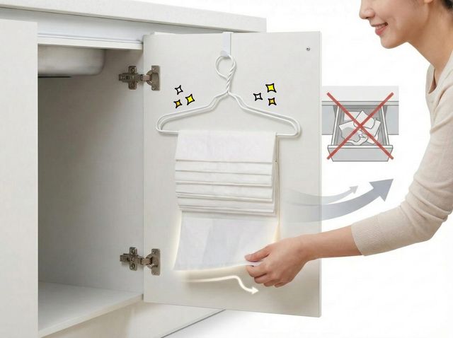 싱크대 하부장 같은 곳에 종량제봉투를 옷걸이를 이용해 보관해 보기. 기사 내용 토대로 AI툴 활용해 제작한 자료사진.