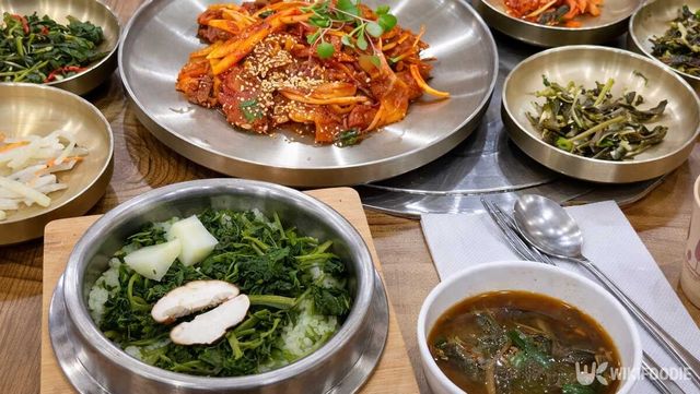 대표 메뉴인 어수리 더덕정식을 주문하면 향긋한 어수리나물 솥밥을 중심으로 다양한 반찬이 함께 차려진다. 구수한 된장찌개와 함께 노릇하게 구워낸 더덕구이, 어수리나물 무침, 취나물, 도토리묵, 잡채 등 한식 반찬이 정갈하게 이어져 든든한 한 끼를 완성한다.