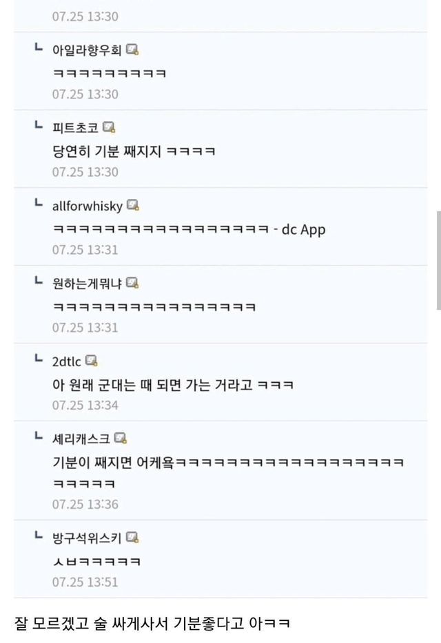 - 공감과 폭소: "당연히 기분 째지지 ㅋㅋㅋ", "원래 군대는 피 보면 가는 거다" 등 군대와 관련된 농담을 던지며 작성자의 기분에 공감했습니다.