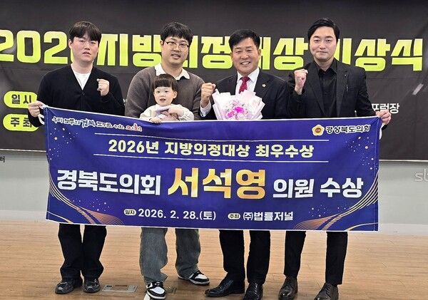 [폴리뉴스 권택석(=경북) 기자] 서석영 경상북도의회 의원(포항, 국민의힘)이 지난달 28일 법률저널이 주최하고 대한민국시도의회의장협의회가 후원하는 '2026 지방의정대상 최우수상'을 수상했다.