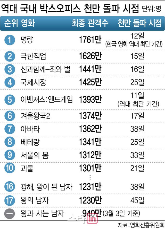 ‘왕사남’의 천만 관객까지 가는 페이스는 역대 한국 영화 중에서도 손에 꼽힌다. 역대 한국 영화 흥행 1~3위에 오른 △‘명량’(1761만, 12일) △‘극한직업’(1626만, 15일) △‘신과함께-죄와 벌’(1441만, 16일) 등에는 못 미치지만, △‘서울의 봄’(1312만, 33일) △‘광해, 왕이 된 남자’(1231만, 38일) △‘왕의 남자’(1230만, 45일)보다는 빠르다.
