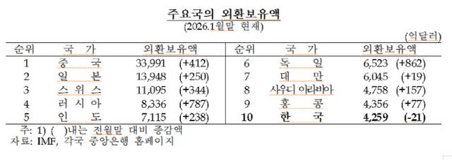 한편 1월 말 기준 우리나라 외환보유액 규모는 세계 10위로 한 단계 떨어졌다. 1위는 중국(3조 3991억달러), 2위는 일본(1조 3948억달러), 3위는 스위스(1조 1095억달러)다. 9위는 홍콩(4356억달러)이 차지했다.