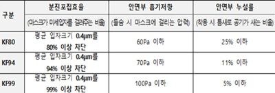 KF94는 94% 이상 차단에 흡기저항 70Pa 이하·누설률 11% 이하, KF99는 99% 이상 차단에 흡기저항 100Pa 이하·누설률 5% 이하를 각각 만족해야 한다.