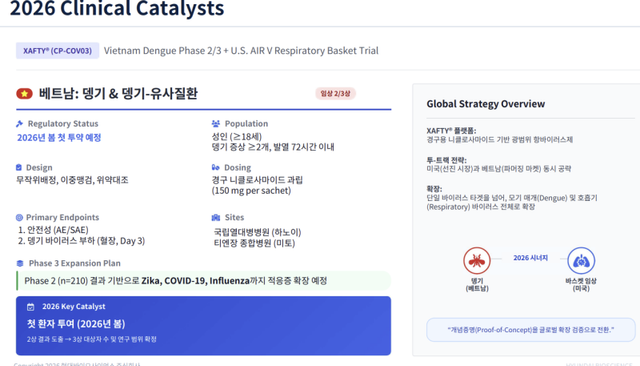 이번 베트남 임상은 뎅기열뿐만 아니라 다음 팬데믹을 대비한 준비이기도 하다. 뎅기열 환자를 대상으로 유효성을 평가하는 파트 1을 넘어 지카, 인플루엔자 등 유사 플라비바이러스 계열로 적응증을 확장하는 파트 2로 설계됐다. 이는 한 종류의 약물로 여러 바이러스를 동시 공략하는 현대바이오만의 바스켓 임상 전략이다.