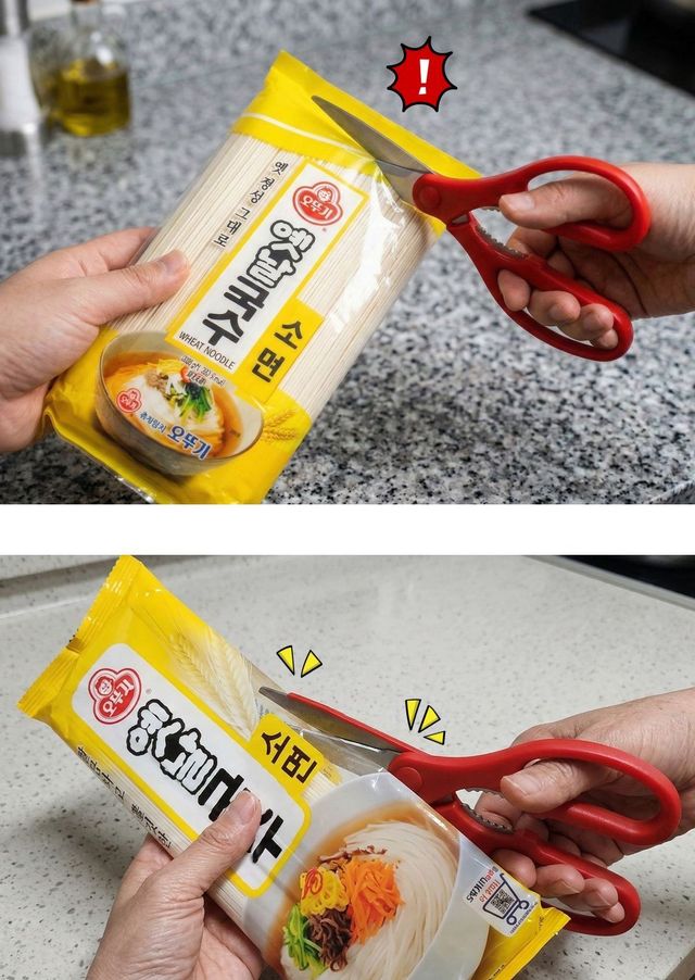 집에서 국수나 파스타를 요리할 때 대부분 같은 방식으로 포장을 뜯는다. 봉지 윗부분을 가위로 가로로 잘라 면을 꺼내는 방식이다. 그러나 이 방법은 생각보다 불편함이 많다. 면이 길고 포장 구멍이 넓어지다 보니 한 번 꺼낼 때 여러 가닥이 같이 쏟아지거나 다시 봉지에 넣는 과정에서 면이 부러지는 일이 자주 생긴다.