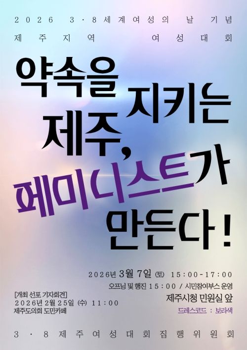 2026 3·8 세계여성의 날 기념 제주지역 여성대회는 오는 7일 오후 3시부터 5시까지 제주시청 광장에서 개최된다.