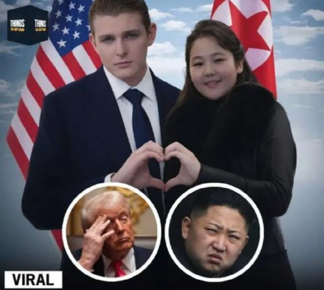 5일 사회관계망서비스(SNS)와 온라인을 중심으로 배런 트럼프와 김주애가 결혼을 앞두고 교제 중인 모습으로 여러 종류의 가상 사진이 공유돼 화제를 모으고 있다.