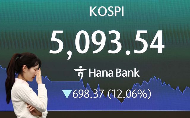 이란전쟁 여파로 코스피 지수가 폭락 마감한 4일 서울 중구 하나은행 본점 딜링룸 전광판에 종가가 표시되어 있다. 이날 코스피지수는 전일대비 698.37p(12.06%) 떨어진 5093.54에 장을 마감했다. / 뉴스1