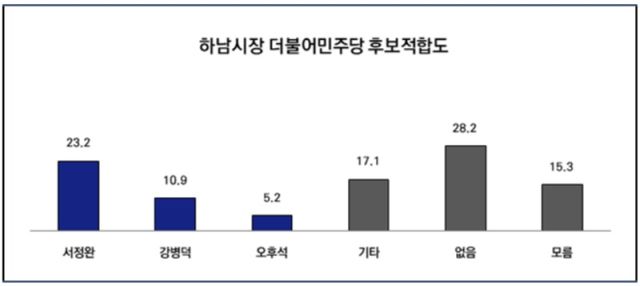 세부적으로는 하남시장 민주당 적합후보 질문에는 서정완 23.2%, 강병덕 10.9%, 오후석 5.2% 순으로 조사됐고, '적합인물 없음'은 28.2%, '모름'은 15.3%로 나타났다. 민주당 지지층에서는 서정완 41.3%, 강병덕 19.1%, 오후석 6.8%로 나타났다.