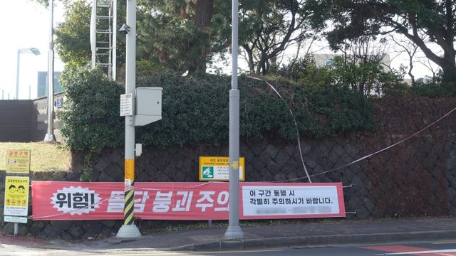 5일 오전 제주시 모 중학교 앞 돌담에는 '위험! 돌담 붕괴 주의'라고 적힌 빨간색 현수막이 내걸렸다. 또 '위험', '안전제일'이라는 글자가 적힌 테이프가 돌담을 느슨하게 감싸고 있었다.