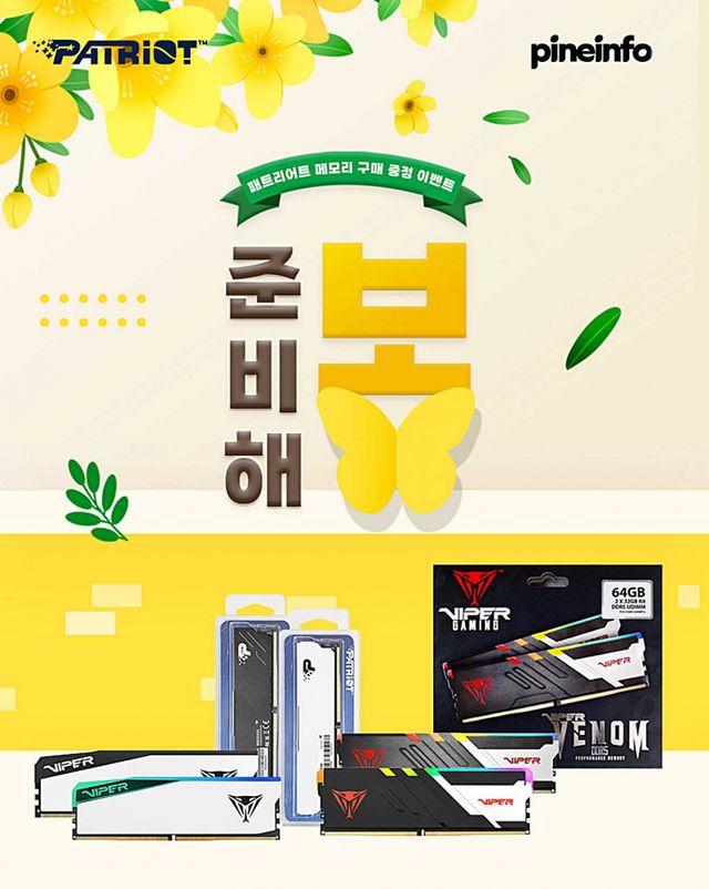 PC 메모리와 SSD 유통 업체 파인인포가 3월 1일부터 3월 31일까지 패트리어트 방열판 메모리 구매 고객 대상 사은품 이벤트를 진행한다. 판매 채널은 스마트스토어와 오픈마켓 등 주요 온라인 쇼핑몰이며, 사은품 재고가 소진되면 종료된다.