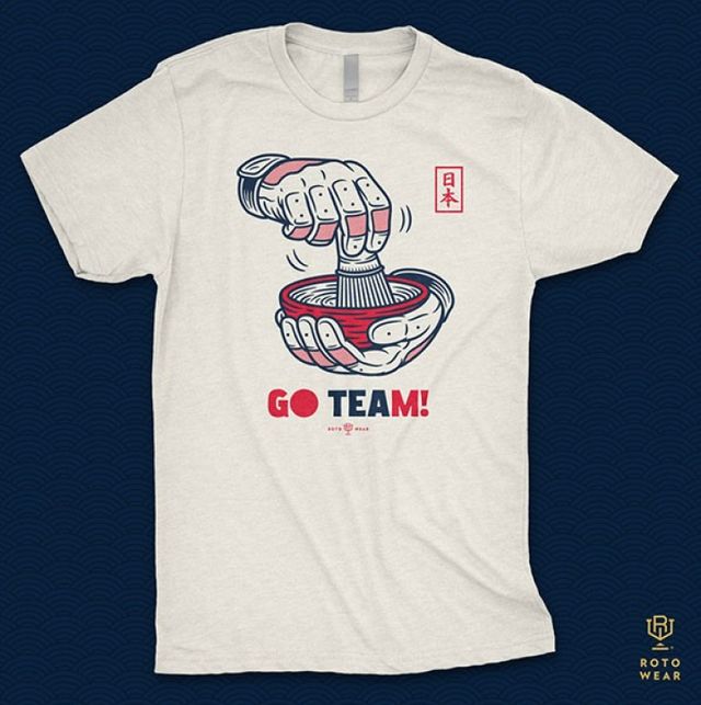 풀카운트는 '2023 WBC 대회에서 라스 눗바(세인트루이스 카디널스)가 선보인 '후추 그라인더' 세리머니가 남녀노소를 가리지 않고 일본 전역을 휩쓸었다'면서 '이번에 로토웨어가 제작한 세리머니 티셔츠는 배팅 장갑을 낀 손이 차를 점차(点茶)하는 모습을 표현한 독특한 디자인으로, 일장기를 넣은 가자 팀 재팬(GO, TEAM) 문구가 적혀 있다'고 전했다.