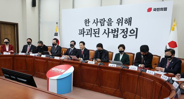 이날 장 대표, 송 원내대표를 비롯한 최고위원회의 참석자들은 '사법 파괴', '헌법 수호'가 적힌 검은 마스크를 착용한 채 왼쪽 가슴에는 '사법부 독립' 근조 리본을 맺다.
