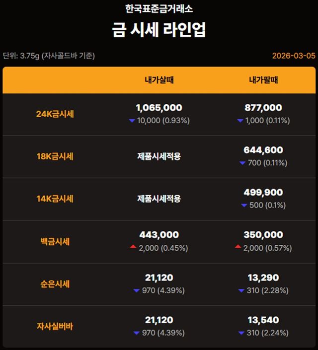 국내 금시세(금값)가 5일(이하 한국 시각) 오후 하락세(전 거래일 대비)로 마감했다.