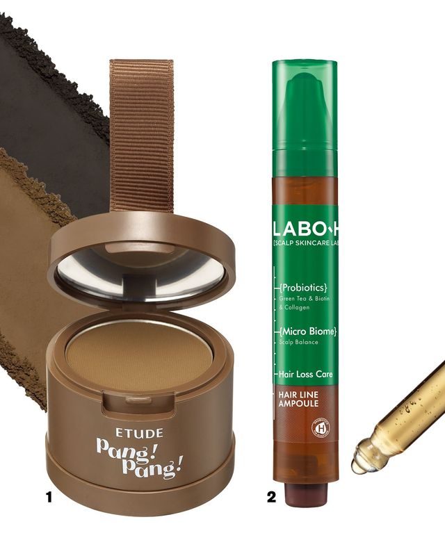 1 비어 보이는 헤어라인을 톡톡 채워 얼굴 윤곽을 또렷하게 보완해준다. 팡팡 헤어 섀도우 1만6천원 Etude.