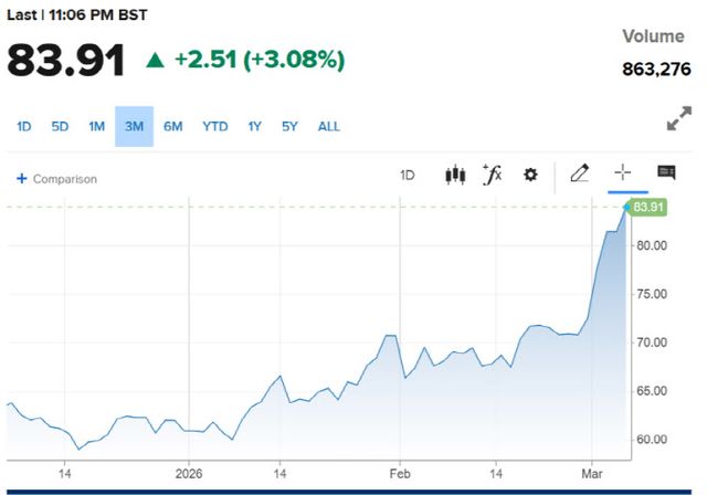 특히 국제유가는 중동 전쟁 여파로 급등하면서 투자자들이 위험회피 심리를 부추기고 있다. 미국 서부텍사스산원유(WTI)는 6.35달러(8.51%) 급등한 배럴당 81.01달러에 마감해 2024년 7월 이후 최고치를 기록했다. 국제 기준유인 브렌트유는 전 거래일보다 4.01달러(4.93%) 오른 배럴당 85.41달러에 거래를 마치며 5거래일 연속 상승했다. 이란이 유조선을 미사일로 공격했다고 밝히면서 원유 공급 차질 우려가 커졌기 때문이다.